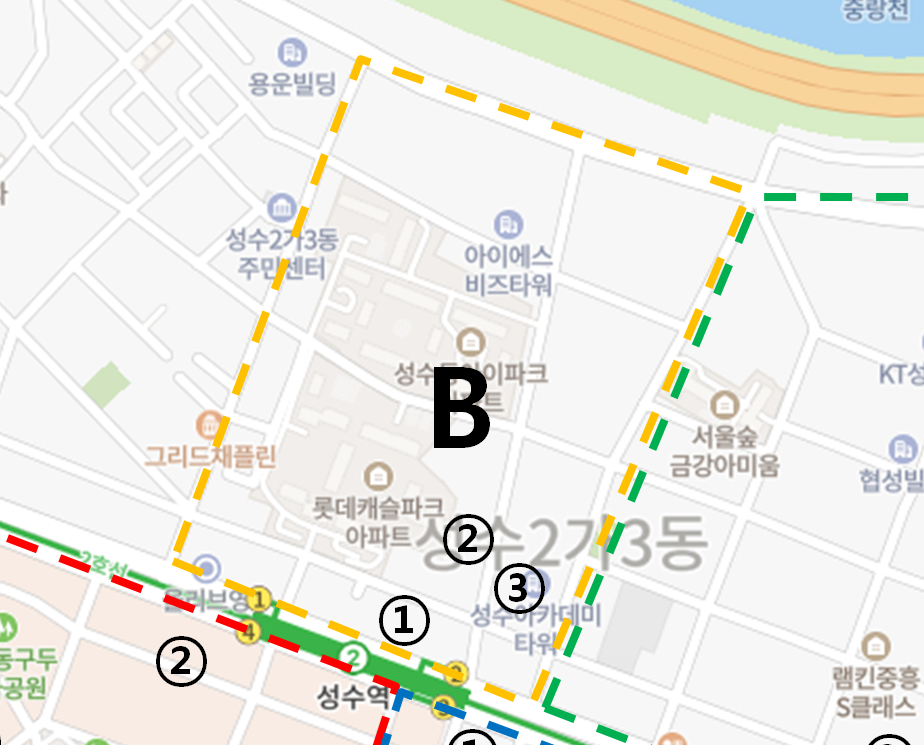 B구역은 성수역 1번출구, 2번출구 인근입니다.